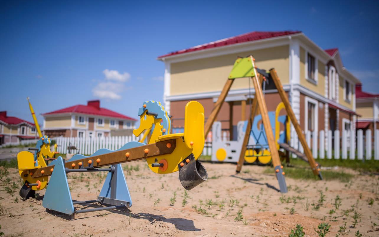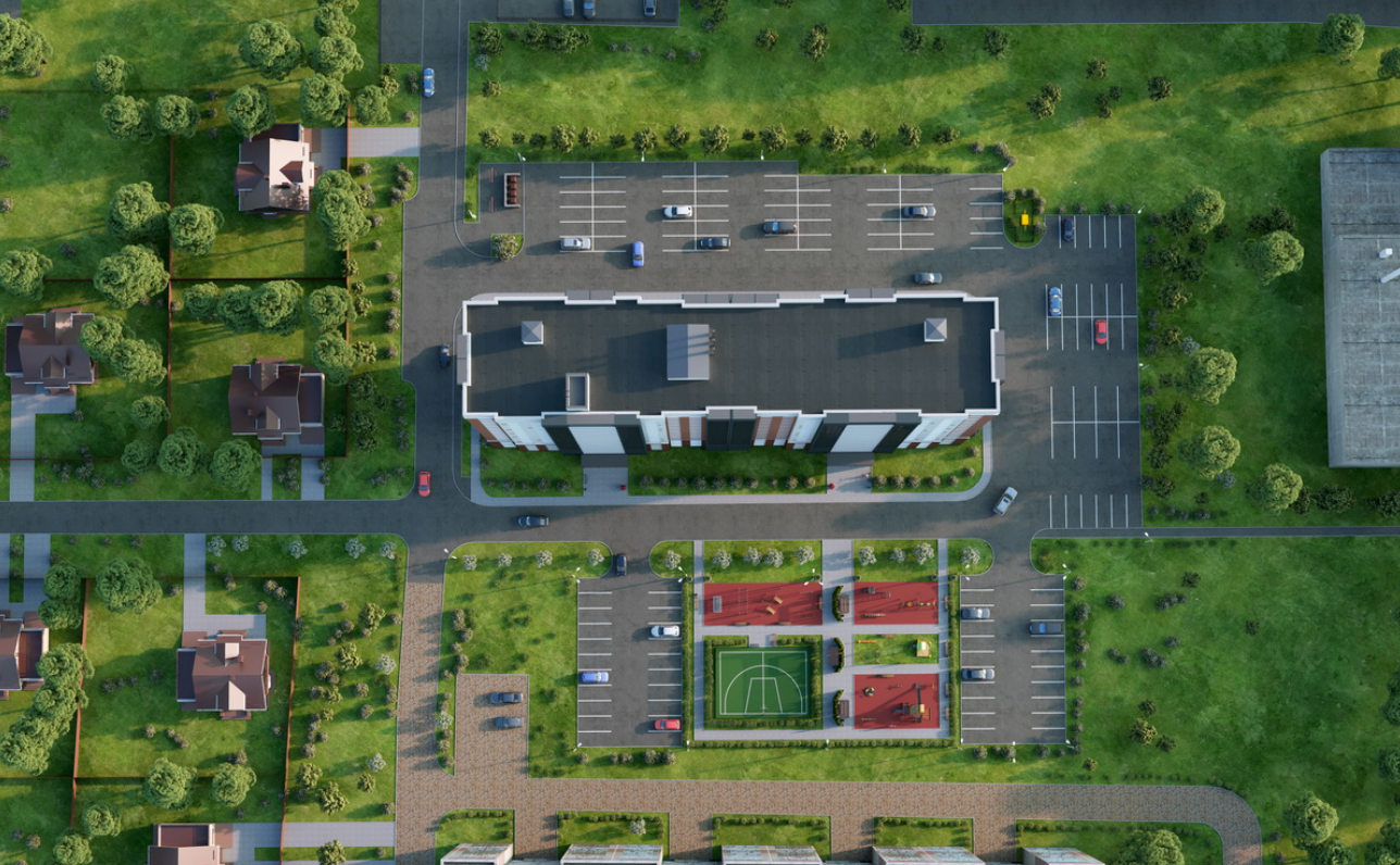Двор: Без машин, с детскими площадками и парковкой.